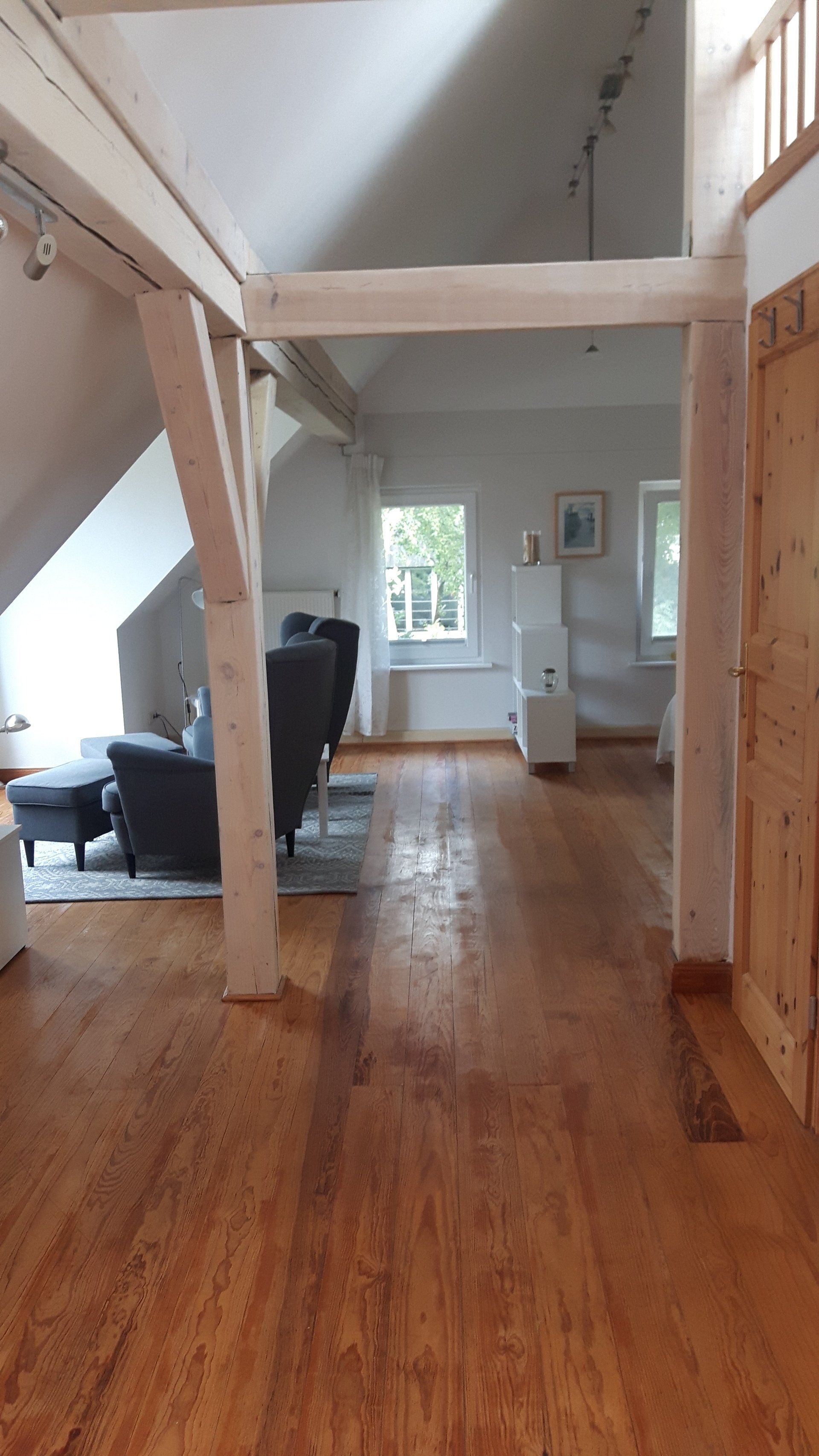 Am anderen Ende der Wohnung steht unter einer Dachschräge ein 1,80m breites Doppelbett und ein Einbaukleiderschrank.
