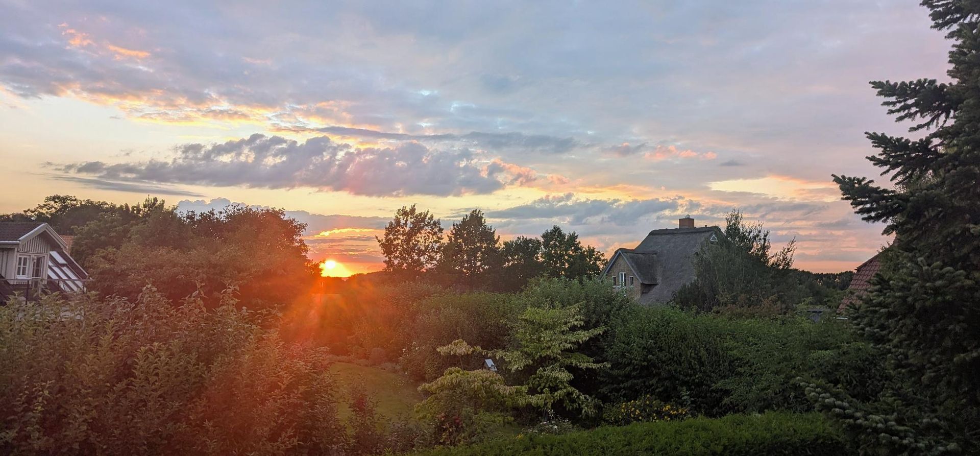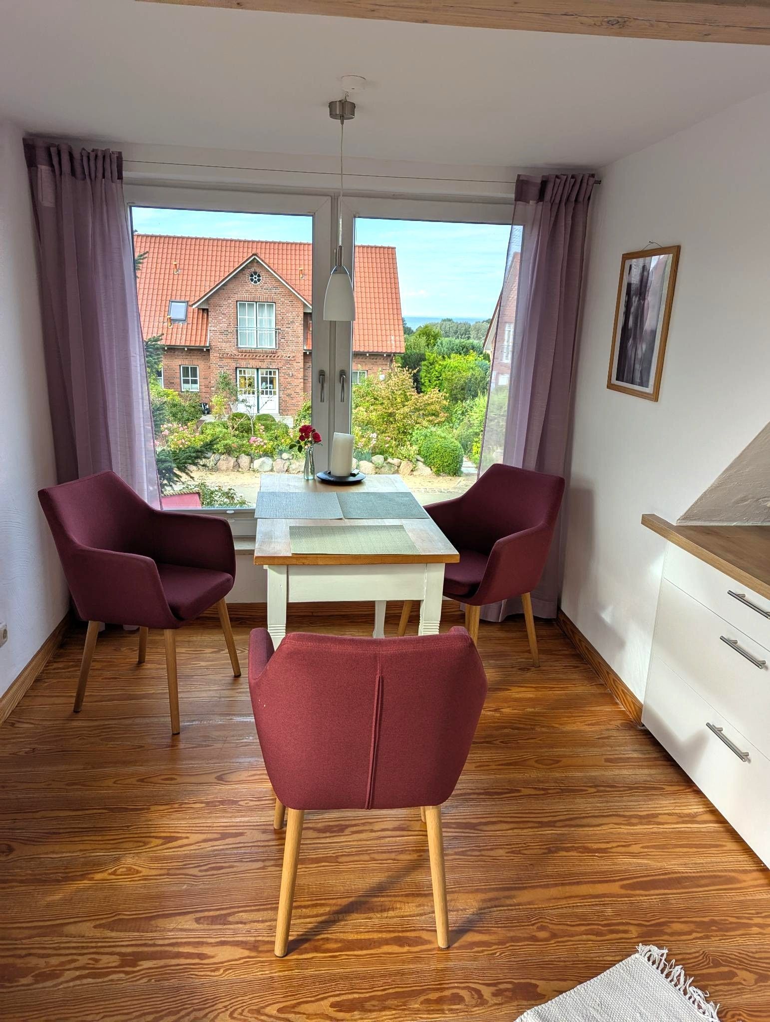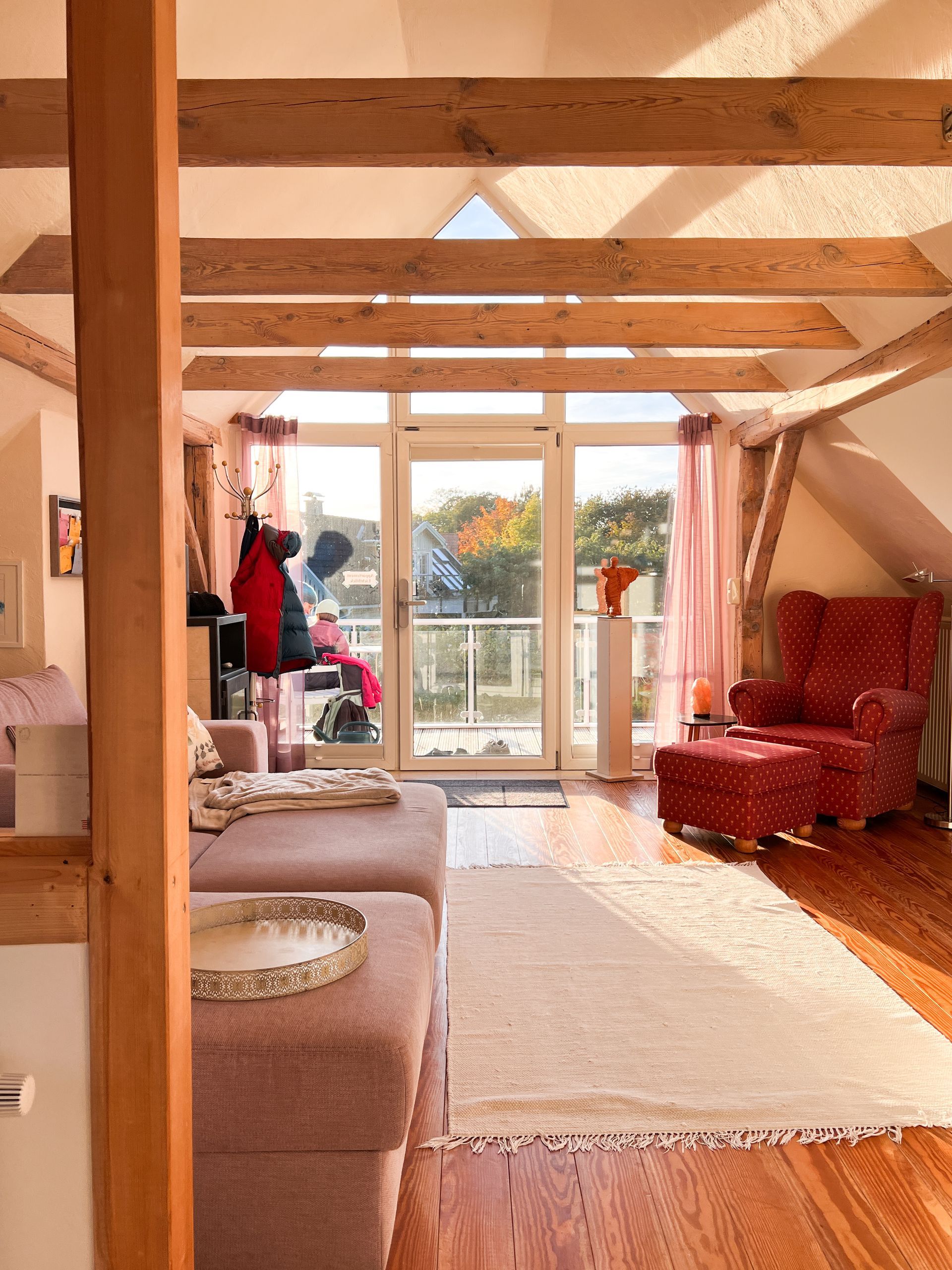 Auch bei bedecktem Wetter ist es hell und freundlich. Der Essplatz befindet sich in einer Gaube mit einem großen Fenster, von dem aus Sie zwischen den gegenüberliegenden Häusern die Ostsee erblicken. Auch von der Küche und vom Bad aus sehen Sie die 500 Meter entfernte Ostsee..