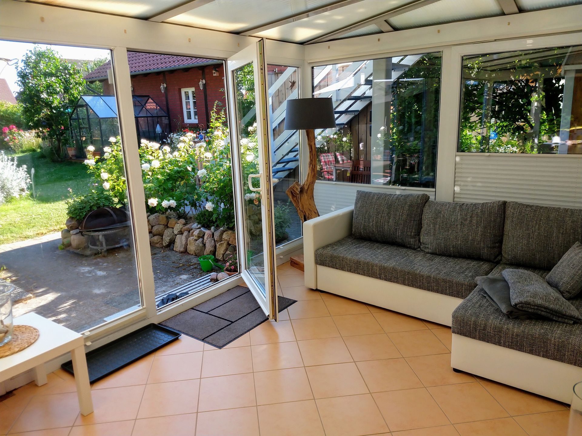 In Ausnahmefällen können zusätzlich noch 2 Personen auf dem Schlafsofa im Wintergarten Platz finden. Alle Fenster des Wintergartens sind mit Plissees versehen und können so gegen zu viel Sonne oder Blicke von außen geschützt werden.